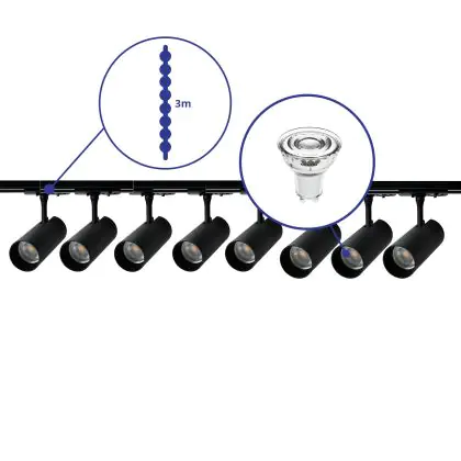 Bright Choice Ensemble complet Rail Monophasé Rail 3 Mètre Noir | incl. 8x Spot + GU10 2700K 3W Dimmable + Embout, Connecteur d’Alimentation et I-Connecteur
