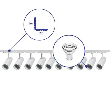 Ensemble complet Rail Monophasé Rail L 2 x 2 Mètre Blanc | incl. 10x Spot + GU10 2700K 3W Dimmable + Embout, Connecteur d’Alimentation et L -Connecteur