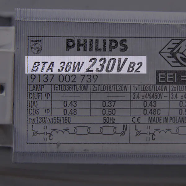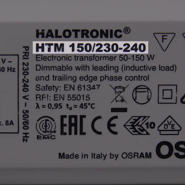 Vous pouvez consulter nos listes de compatibilité et de gradateurs de Noxion, Philips et Osram / Ledvance. De plus, nous vous aidons volontiers à déterminer le type de gradateur, de ballast ou de transformateur dont vous disposez. Ceci est indiqué comme suit sur l'accessoire d'éclairage :