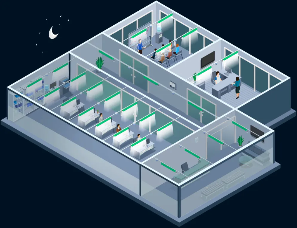 De bezettingsgraad in gemeenschappelijk kantoorruimten is gemiddeld 60%, zeker nu vele bedrijven zich een bepaalde mate van thuiswerken eigen hebben gemaakt. Het gebruik van sensoren zorgt ervoor dat op bezette plekken een juiste lichtintensiteit wordt gerealiseerd. Op basis van de natuurlijke (licht van buiten) en de kunstmatige (verlichting) lichtopbrengst, wordt gemeten hoeveel lux de armaturen dienen uit te laten stralen. Is er niemand in een ruimte aanwezig, dan wordt de verlichting uitgeschakeld. Deze monitoring resulteert in een extra energiebesparing van 5 tot 20%, bovenop de vermindering die LED op zichzelf al realiseert.
