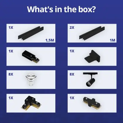 | Nom du fabricant | Complete L shaped 1-Phase Track Set Black incl. 8x Spot fixture + GU10 2700K 3W Dim – 1,5 x 2 meter | |