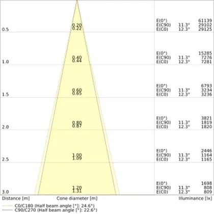 De gradenbundel geeft informatie over hoe breed het licht wordt uitgestraald. Dit zit tussen de 0 en 360 graden (D). Hoe kleiner de hoek, hoe specifieker de lichtbundel is. Over het algemeen is een smalle gradenbundel perfect voor sfeer- of accentverlichting, terwijl een brede gradenbundel ideaal is om grote oppervlaktes te verlichten.